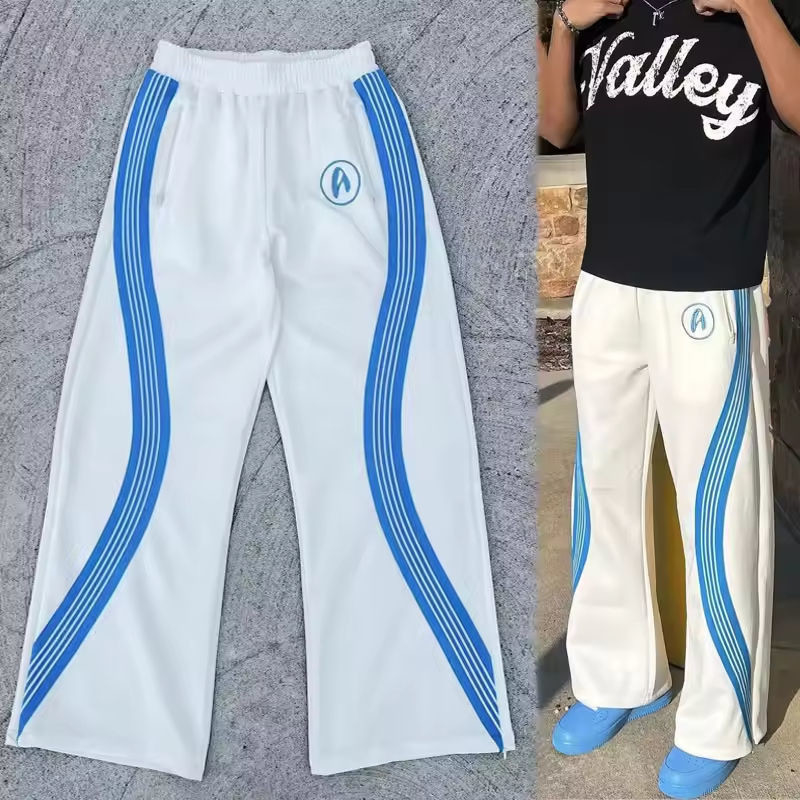 Nome do produto: | Roupas de rua personalizadas Pantalões com listras Logotipo bordado Saco grande, perna larga, algodão de tricô, pista de corrida Flare Pantalão de suor para homens |